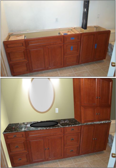 bathroom design simulation, before and after items added: upper-right cabinet assembly, marble counter-top, drawer knob placement, wall paint color & lighting simulation.